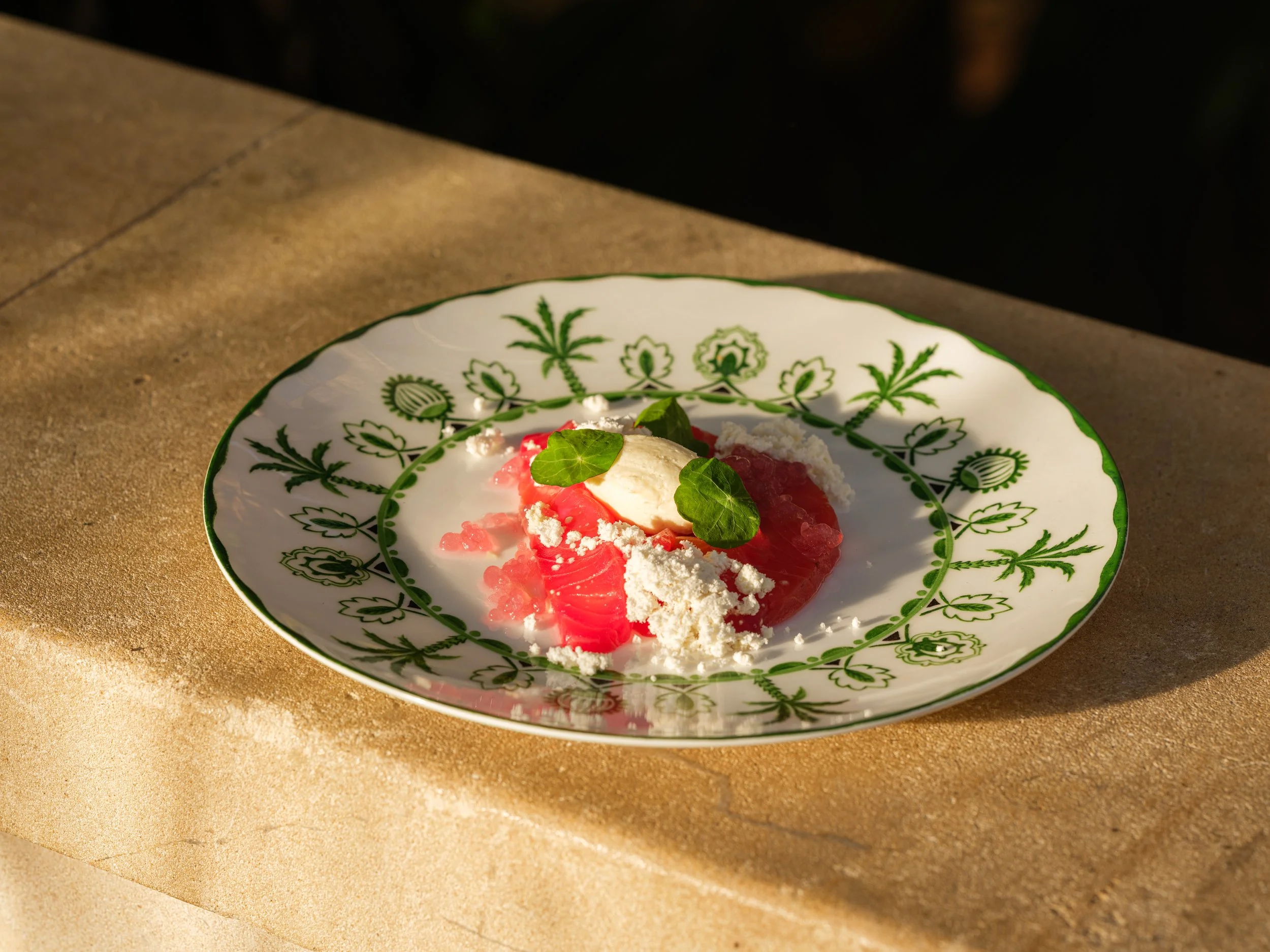 Carpaccio of beets with horseradish cream and a dusting of olive oil snow (V)